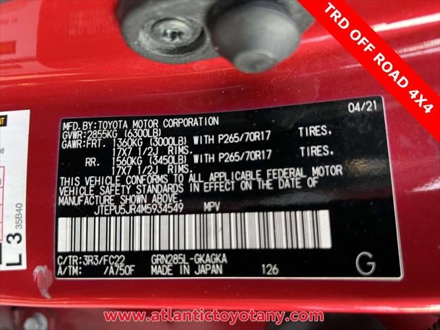 Subject to the primary lender's approval. All prices exclude tax, title, dealer fee of $695, tags, license & DMV. Vehicles are sold cosmetically as is. Not all cars are certified where as many do pass the certification process, the customer does have the right to add an optional extended service agreement. 2021 Toyota 4Runner TRD Off-Road PASSES STATE INSPECTION, REMAINDER OF FACTORY WARRANTY, SERVICE RECORDS AVAILABLE, Acoustical Package, Alloy Wheels, Ambient Light Package, Audio Package, Backup Camera, Bluetooth®, Climate Package, Convenience Light Package, Courtesy Lights Illum Package, Extra Value Package, Heat Package, Light Package, Memory Package, Multimedia Package, Off Road Package, Popular Equipment Package, Power Mirror Package, Power Package, Preferred Accessory Package, Quiet Package, Safety Package, TRD Package, Trim Package, Value Package, name, 4Runner TRD Off-Road, 4D Sport Utility, 4.0L V6 SMPI DOHC, 5-Speed Automatic with Overdrive, 4WD, Barcelona Red Metallic, Black/Graphite w/Fabric Seat Trim, 3.727 Axle Ratio, 4-Wheel Disc Brakes, 8 Speakers, ABS brakes, Air Conditioning, Alloy wheels, AM/FM radio: SiriusXM, Anti-whiplash front head restraints, Apple CarPlay/Android Auto, Auto High-beam Headlights, Black Roof Rails, Brake assist, Bumpers: body-color, Compass, Driver door bin, Driver vanity mirror, Dual front impact airbags, Dual front side impact airbags, Electronic Stability Control, Emergency communication system: Safety Connect with 1-year trial, Exterior Parking Camera Rear, Fabric Seat Trim, Front anti-roll bar, Front Bucket Seats, Front Center Armrest, Front fog lights, Front reading lights, Front wheel independent suspension, Heated door mirrors, Illuminated entry, Knee airbag, Leather Shift Knob, Low tire pressure warning, Occupant sensing airbag, Outside temperature display, Overhead airbag, Overhead console, Panic alarm, Passenger door bin, Passenger vanity mirror, Power door mirrors, Power driver seat, Power steering, Power windows, Radio: Audio Plus, Rear anti-roll bar, Rear seat center armrest, Rear window defroster, Rear window wiper, Remote keyless entry, Roof rack: rails only, Security system, Speed control, Speed-sensing steering, Split folding rear seat, Spoiler, Steering wheel mounted audio controls, Tachometer, Telescoping steering wheel, Tilt steering wheel, Traction control, Trip computer, Variably intermittent wipers, Wheels: 17 x 7.5 7-Spoke Unique Off-Road Alloy. 4WD 5-Speed Automatic with Overdrive 4.0L V6 SMPI DOHC Price subject to change Subject to primary lenders approval. All prices exclude tax, title, dealer fees of $695, tags, license & DMV. Must finance through dealer when applicable & take same day delivery. Vehicles are sold cosmetically as is.
